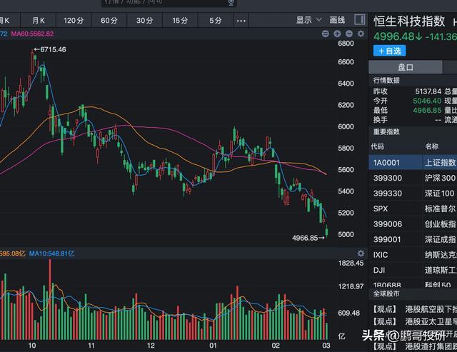 今天所有的成分股都是大跌的,这些股票暴跌,导致的是恒生科技指数又破位下跌,今天恒生科技指数跌到4996点,5000点的关口也跌破了,这一波恒生科技指数暴跌3%,新一波的下跌空间又打开了。