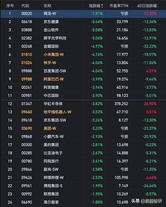 美伊打架,竟然最受伤的还是港股的科技股,这也太惨了吧,今天全球市场都在利空的消息下低开,但是走势却不尽相同,A股,日本股市都是低开后一路震荡走高,只有香港市场低开后一路走低,尤其是互联网大厂,这一波直接杀疯了啊。阿里暴跌4%新低,小米暴跌5%新低,商汤更是暴跌了8%。